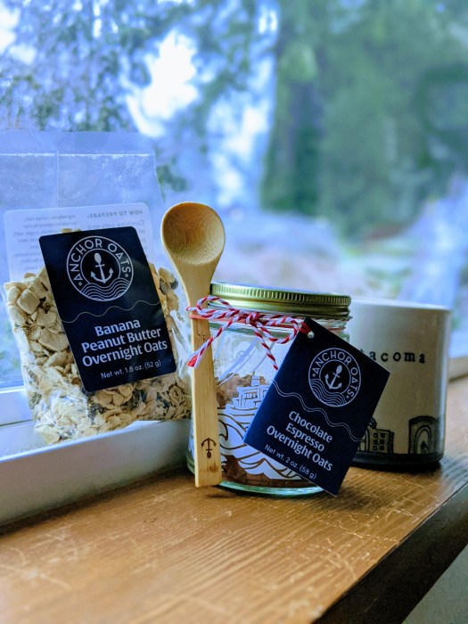 Hearty, healthy, premium oatmeal and overnight oats are mixed and packaged in Tacoma by Anchor Oats. Included in the basket are a package of Banana Peanut Butter Overnight Oats and a gift set with Chocolate Expresso Overnight Oats.