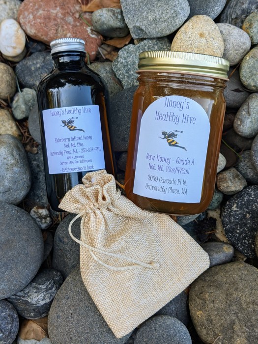 Award-winning raw honey from bees in the 253 goes in to Honeys Healthy Hive edibles and body products, including this honey, elderberry syrup, and lotion bar!