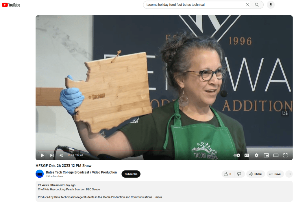 If you scroll through Bates Technical College Video Production Live Streams on YouTube, you’ll see Tacoma Holiday Food & Gift Festival cooking shows dating back to 2018.